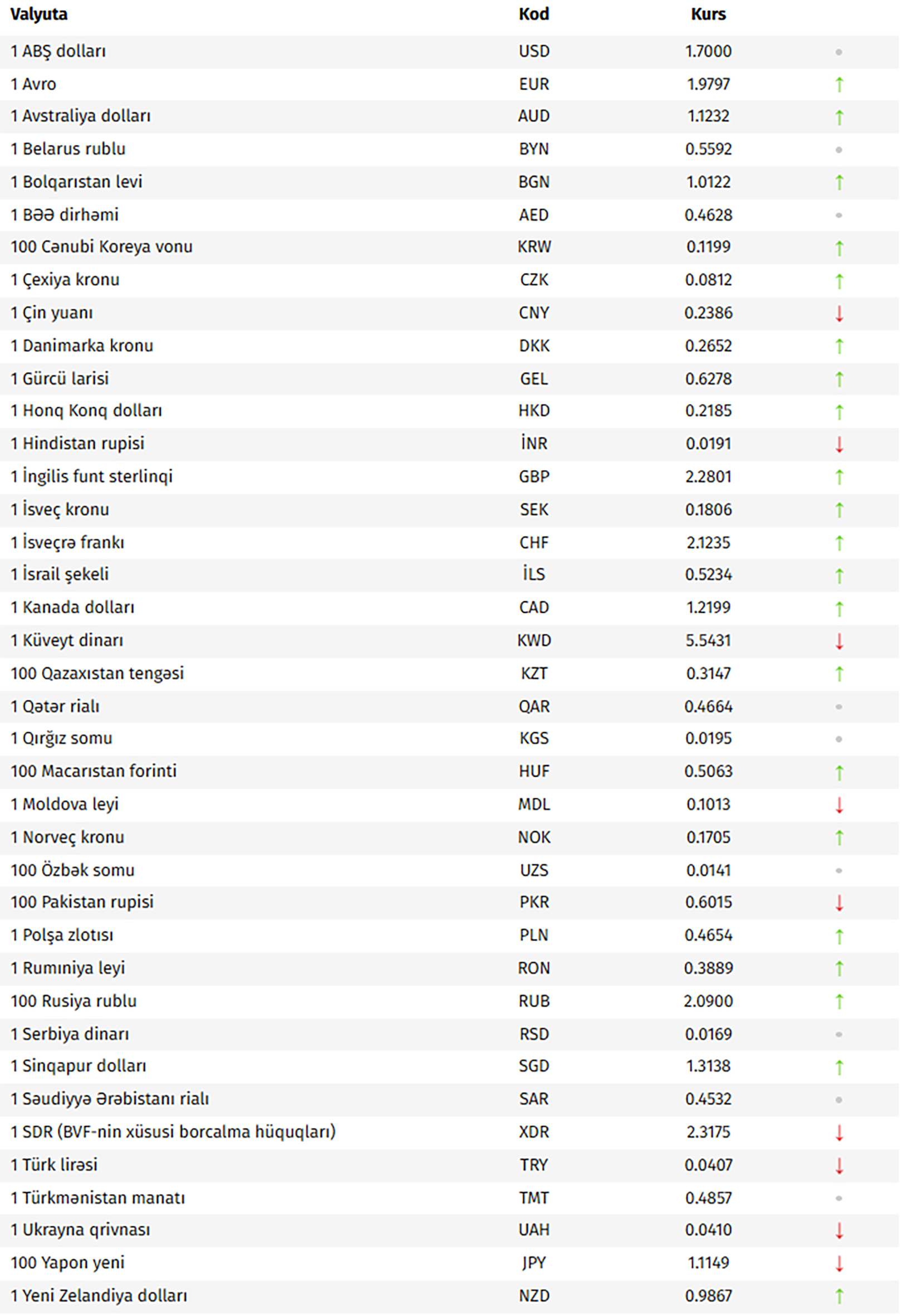 Azərbaycan Mərkəzi Bankının bu günə olan rəsmi valyuta məzənnələrinə əsasən, ABŞ dollarının məzənnəsi dəyişməyərək 1,7000 manat olub.