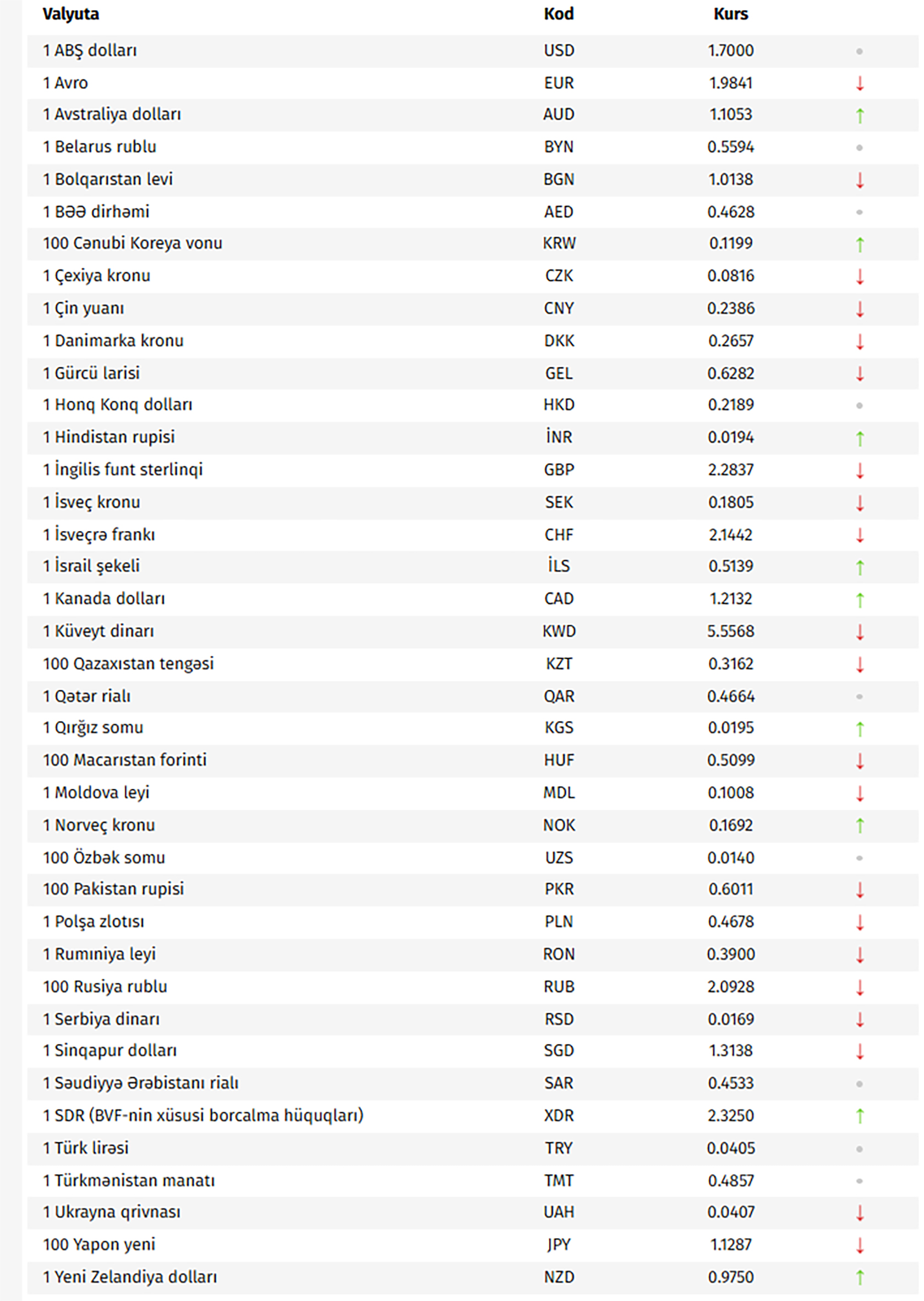 Azərbaycan Mərkəzi Bankının bu günə olan rəsmi valyuta məzənnələrinə əsasən, ABŞ dollarının məzənnəsi dəyişməyərək 1,7000 manat olub.