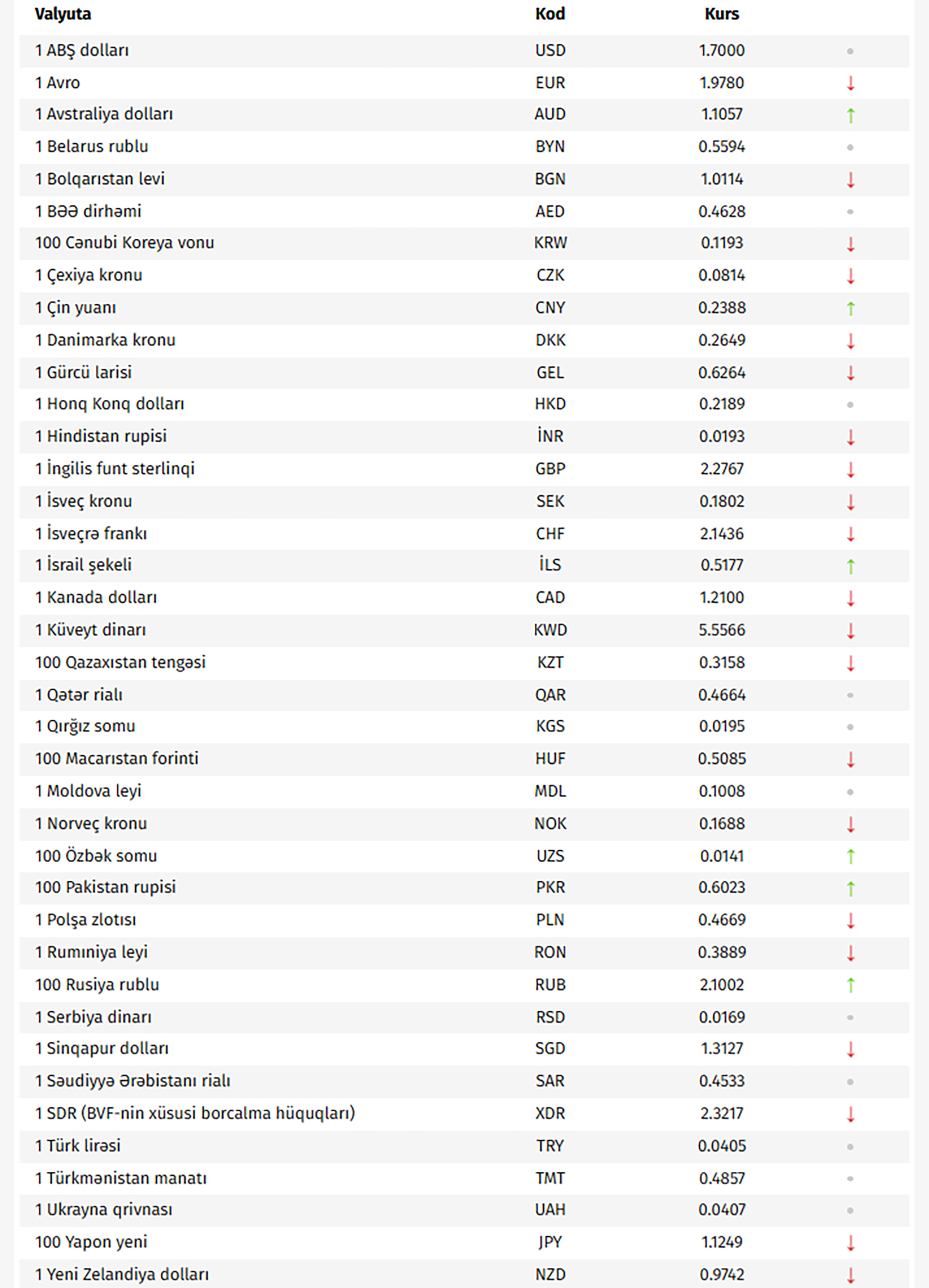 Azərbaycan Mərkəzi Bankının bu günə olan rəsmi valyuta məzənnələrinə əsasən, ABŞ dollarının məzənnəsi dəyişməyərək 1,7000 manat olub.