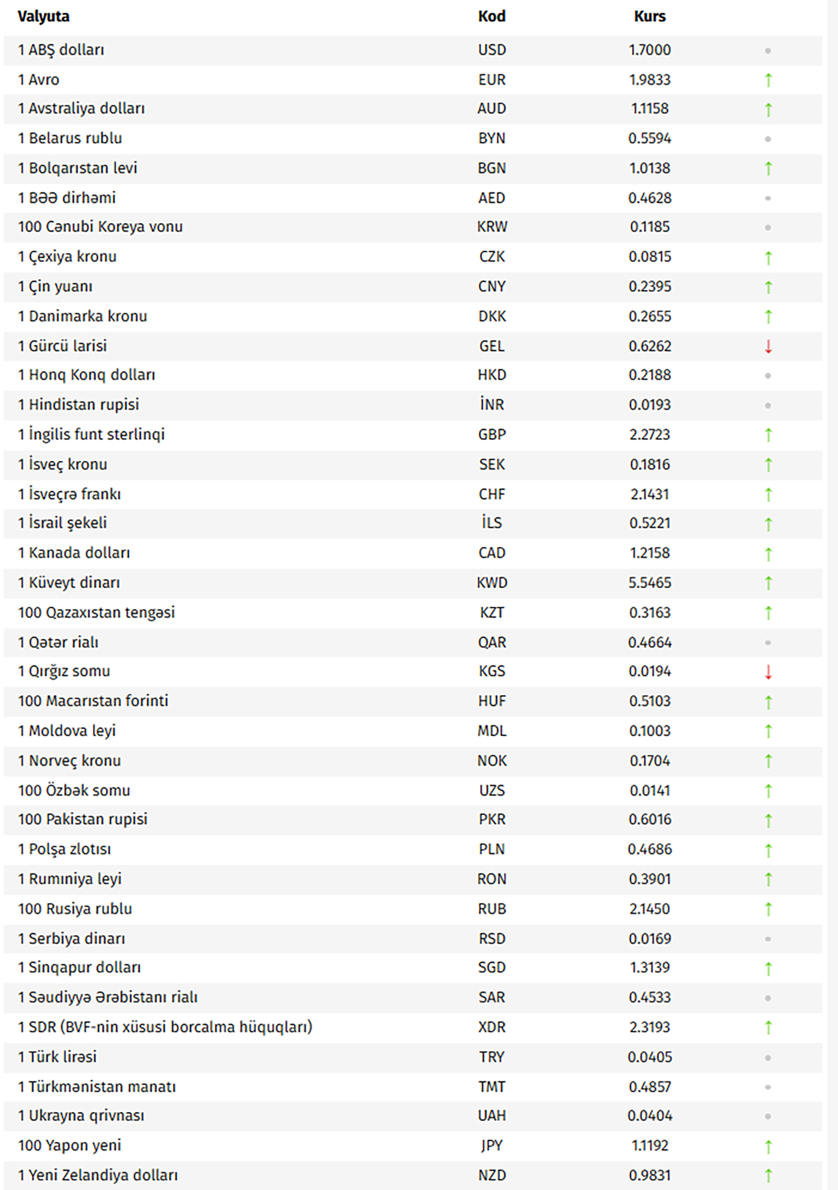 Azərbaycan Mərkəzi Bankının bu günə olan rəsmi valyuta məzənnələrinə əsasən, ABŞ dollarının məzənnəsi dəyişməyərək 1,7000 manat olub.