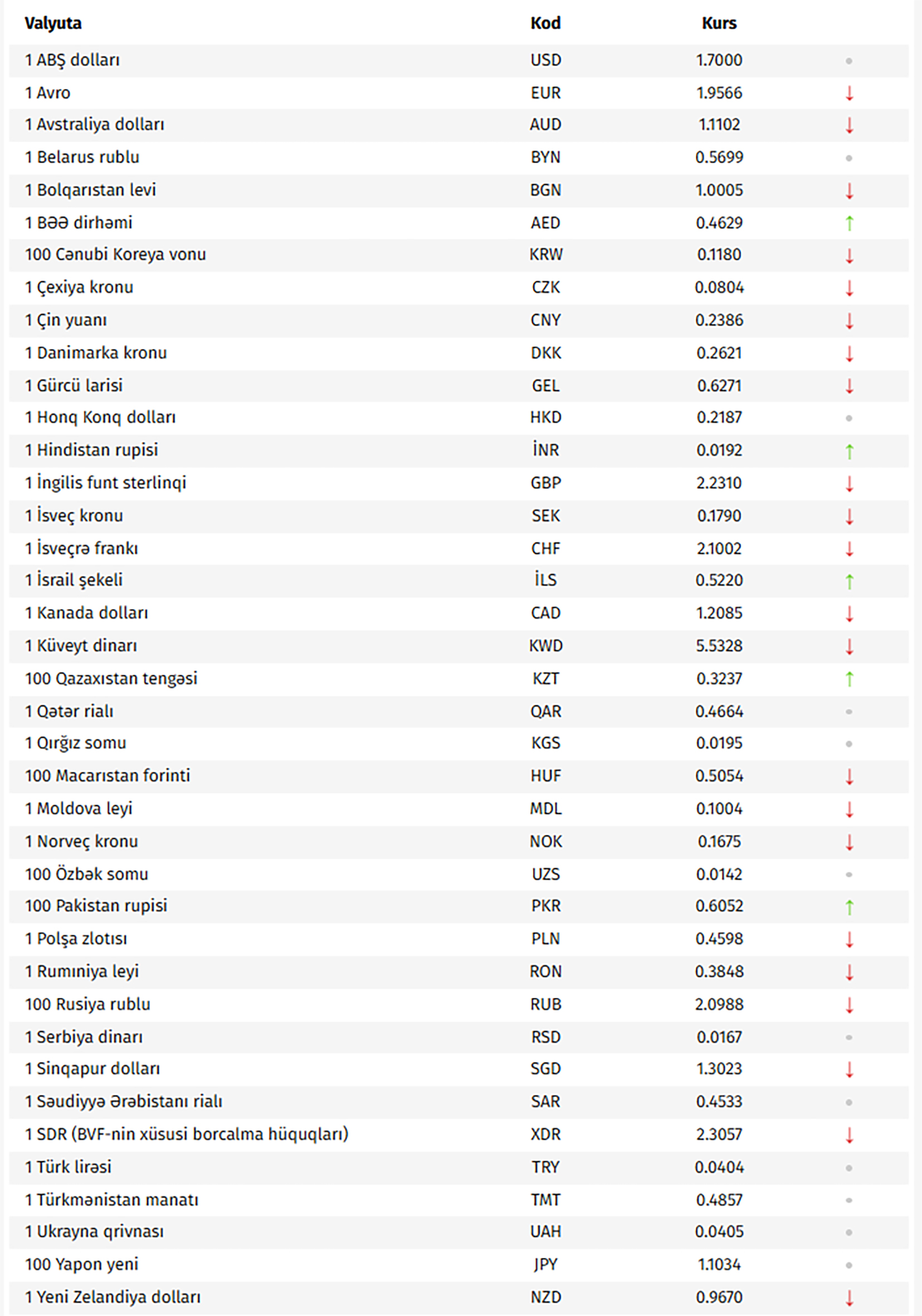 Azərbaycan Mərkəzi Bankının bu günə olan rəsmi valyuta məzənnələrinə əsasən, ABŞ dollarının məzənnəsi dəyişməyərək 1,7000 manat olub.