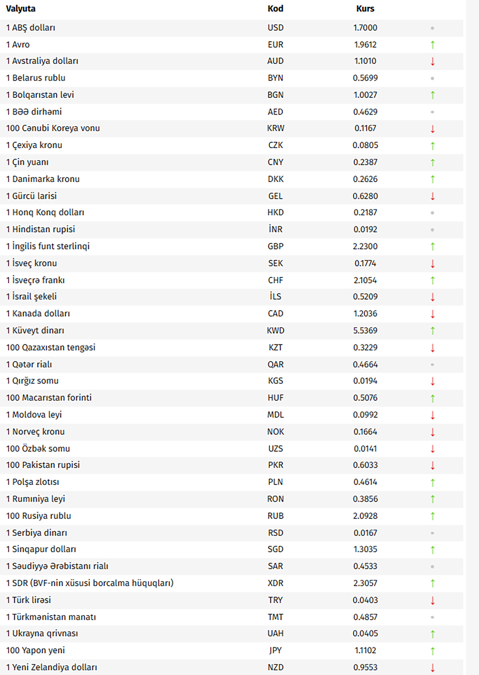 Azərbaycan Mərkəzi Bankının bu günə olan rəsmi valyuta məzənnələrinə əsasən, ABŞ dollarının məzənnəsi dəyişməyərək 1,7000 manat olub.