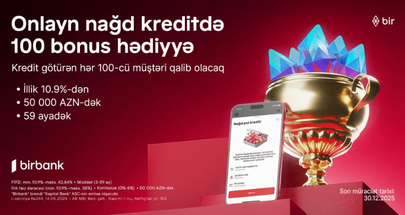 “Hər 100-cü müştəriyə 100 bonus hədiyyə” kampaniyası 30 dekabr 2025-ci il tarixinədək davam edəcək. Kampaniya çərçivəsində kapitalbank.az, birbank.az, birbank və m10 tətbiqlərindən 10.9%-dən başlayan şərtlərlə onlayn nağd kredit əldə edən hər 100-cü müştəri 100 bonus hədiyyə qazanır. Qalib müştərilərə verilən bonusların köçürülməsi kreditin rəsmiləşmə tarixindən etibarən 5 iş günü ərzində icra edilir.