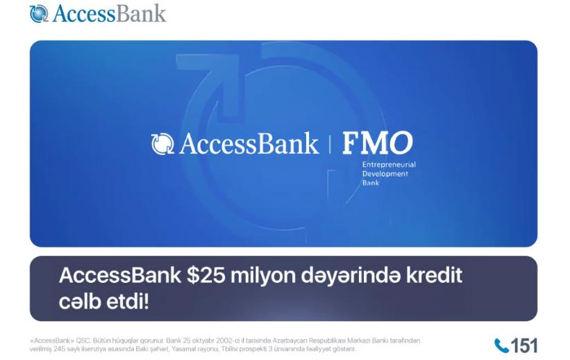 Azərbaycanın mikro, kiçik və orta sahibkarlığın (KOB) maliyyələşdirilməsində ixtisaslaşmış aparıcı maliyyə institutlarından biri olan AccessBank, Niderland İnkişafı Bankı (FMO – Nederlandse Financierings-Maatschappij voor Ontwikkelingslanden N.V.) ilə 25 milyon ABŞ dolları məbləğində üçillik kredit müqaviləsinin imzalandığıı elan edir.