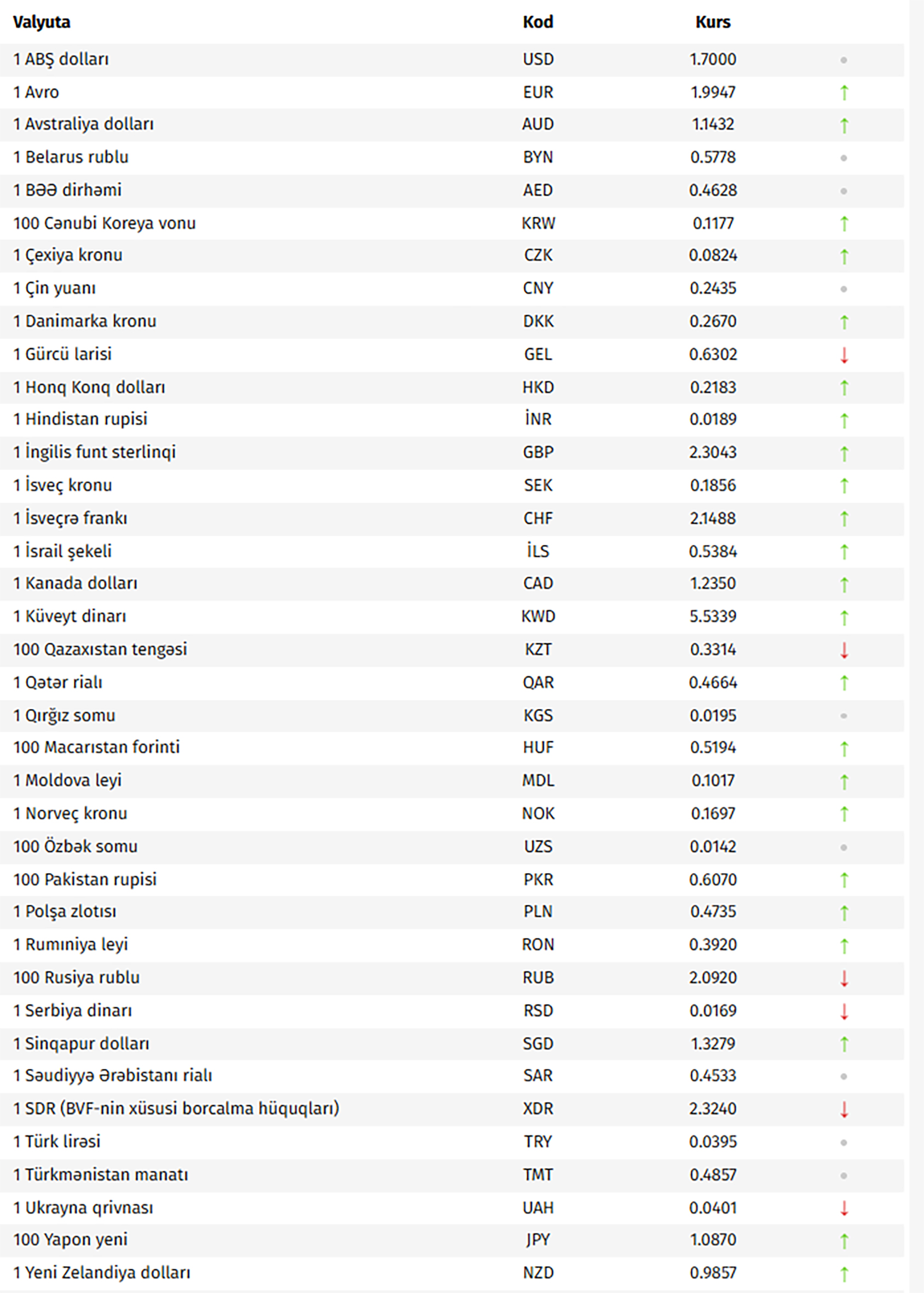 Azərbaycan Mərkəzi Bankının bu günə olan rəsmi valyuta məzənnələrinə əsasən, ABŞ dollarının məzənnəsi dəyişməyərək 1,7000 manat olub.