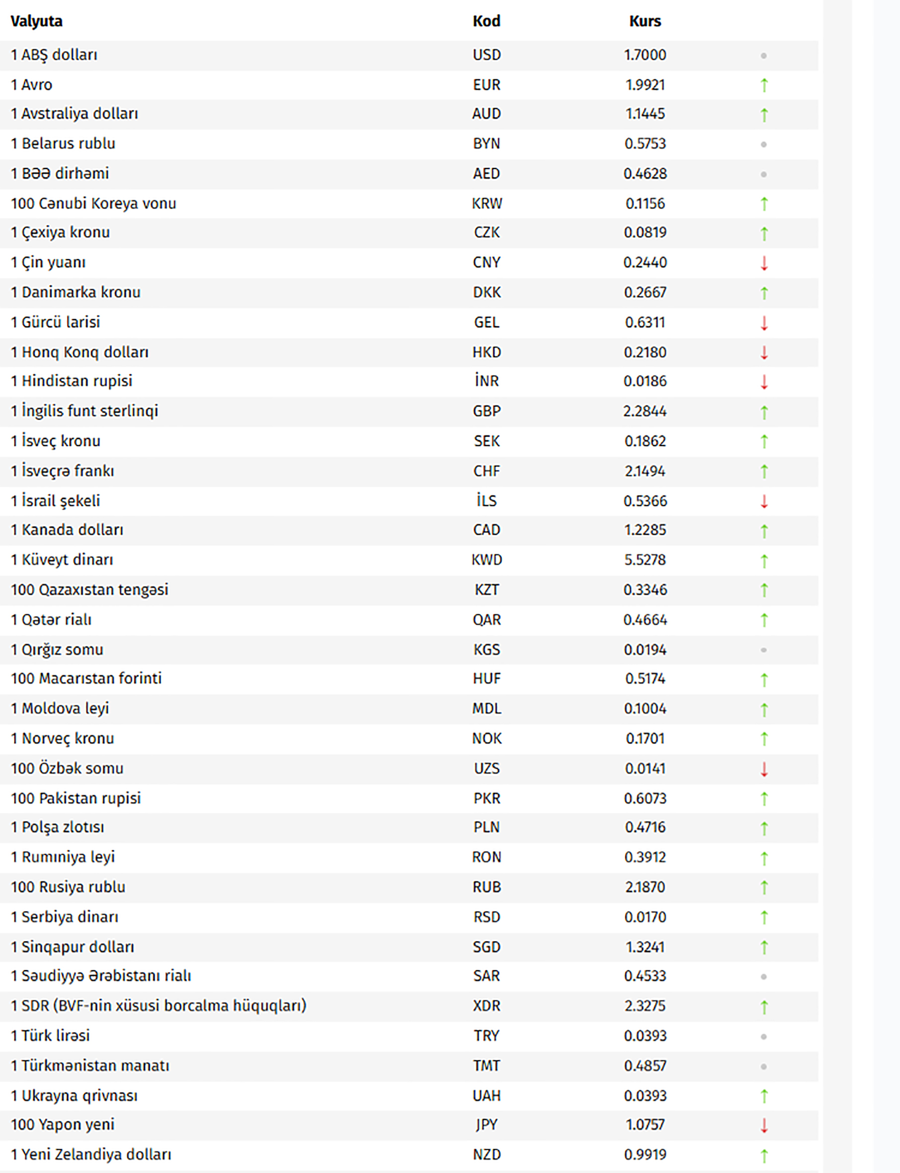 Azərbaycan Mərkəzi Bankının bu günə olan rəsmi valyuta məzənnələrinə əsasən, ABŞ dollarının məzənnəsi dəyişməyərək 1,7000 manat olub.