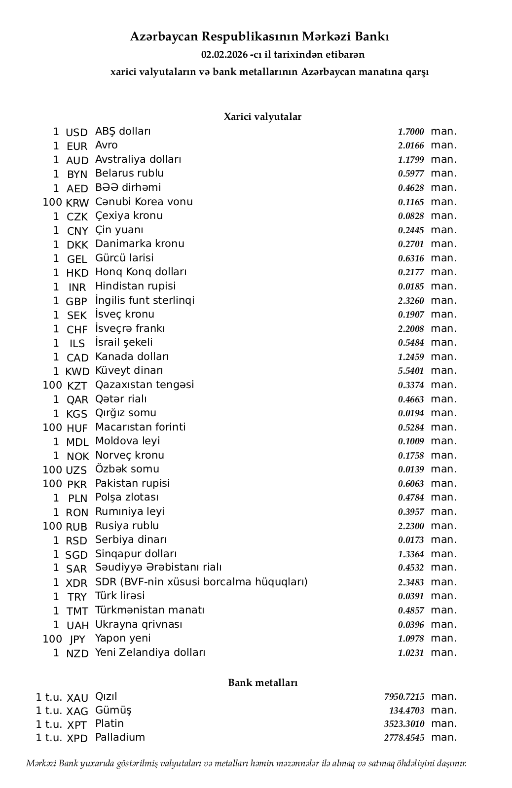 Azərbaycan Mərkəzi Bankının bu günə olan rəsmi valyuta məzənnələrinə əsasən, ABŞ dollarının məzənnəsi dəyişməyərək 1,7000 manat olub.