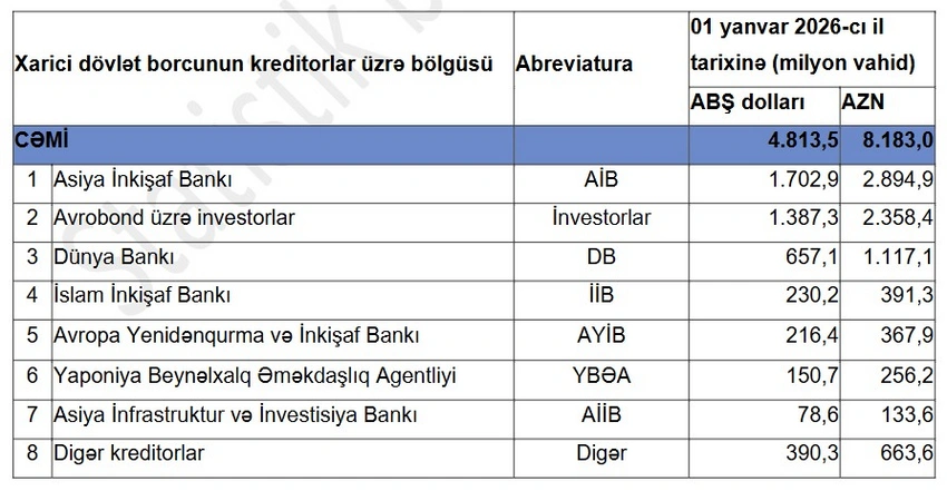 Azərbaycanın xarici dövlət borcunun yeni tərkibi açıqlanıb