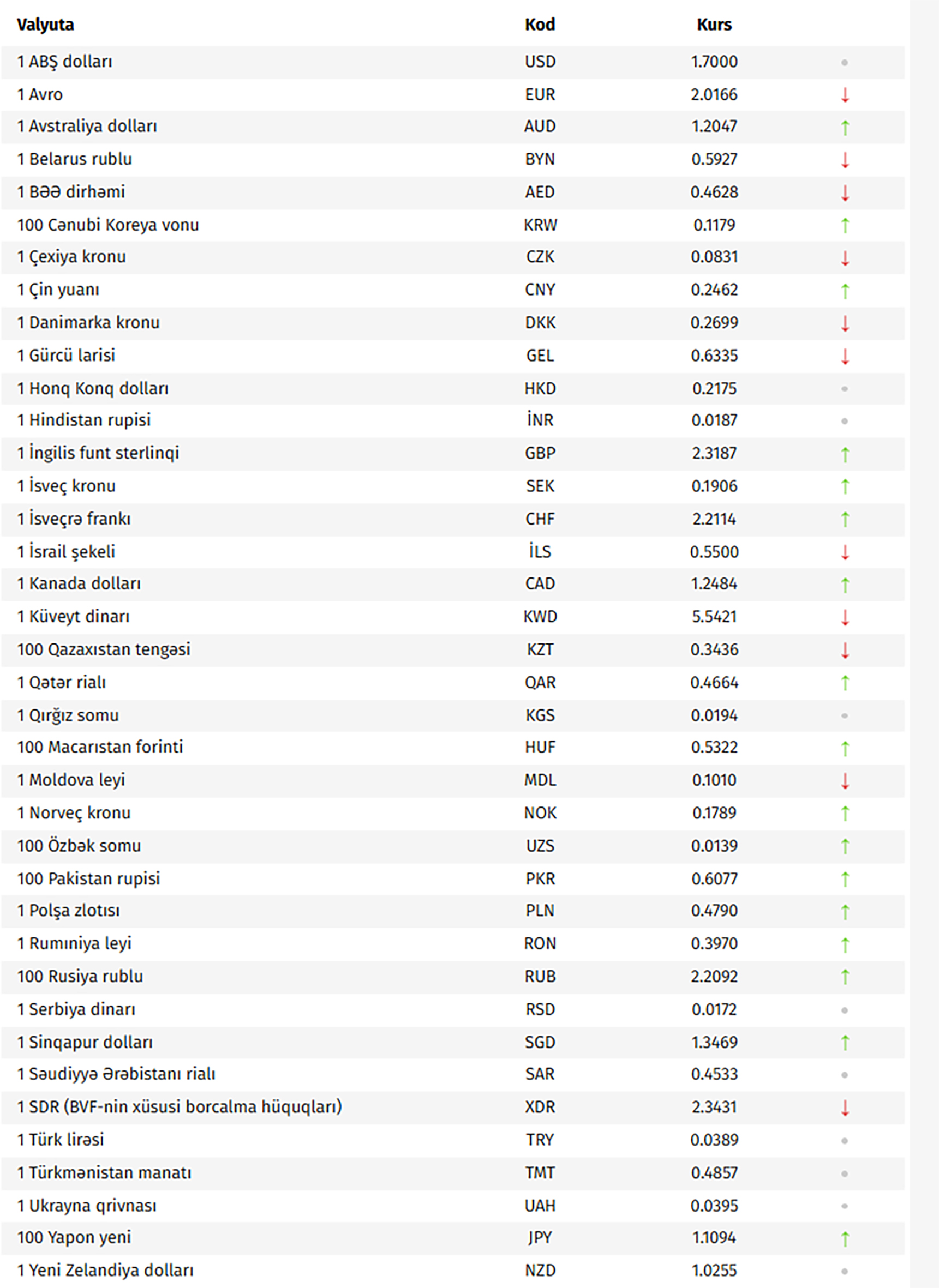 Azərbaycan Mərkəzi Bankının bu günə olan rəsmi valyuta məzənnələrinə əsasən, ABŞ dollarının məzənnəsi dəyişməyərək 1,7000 manat olub.