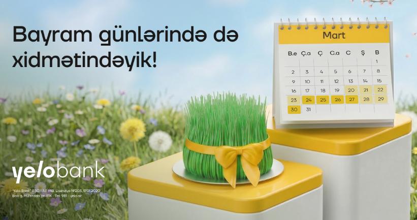 Novruzun gəlişi ilə elan olunan uzun tətil günlərində Yelo Bank müştərilərini diqqətsiz qoymur. Bayram günlərində də bank işlərini rahatca həll edə bilmən üçün Bakı və bölgə filialları xüsusi iş qrafiki ilə fəaliyyət göstərəcək.