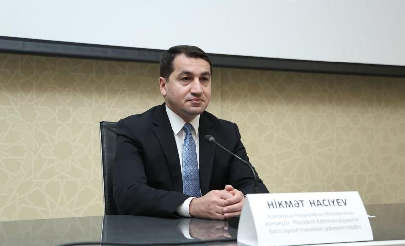 Prezidentin köməkçisi, Prezident Administrasiyasının xarici siyasət məsələləri şöbəsinin müdiri Hikmət Hacıyev Ermənistan tərəfinin cəbhədə etdiyi təxribatla bağlı brifinq keçirir.