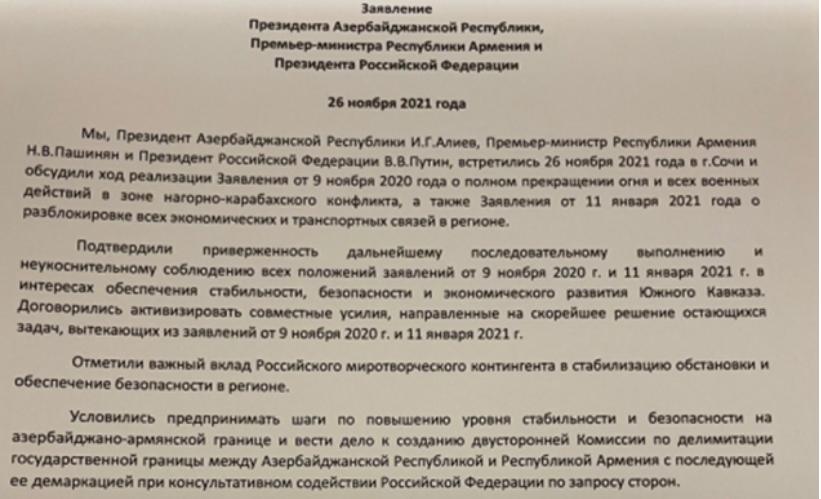“Biz, Azərbaycan Respublikasının Prezidenti İ.H.Əliyev, Ermənistan Respublikasının baş naziri N.V.Paşinyan və Rusiya Federasiyasının Prezidenti V.V.Putin 2021-ci il noyabrın 26-da Soçi şəhərində görüşdük və Dağlıq Qarabağ münaqişəsi zonasında atəşin və bütün hərbi əməliyyatların tamamilə dayandırılması haqqında 2020-ci il 9 noyabr tarixli Bəyanatın, həmçinin regionda bütün iqtisadi və nəqliyyat əlaqələrinin bərpası haqqında 2021-ci il 11 yanvar tarixli Bəyanatın yerinə yetirilməsinin gedişini müzakirə etdik.