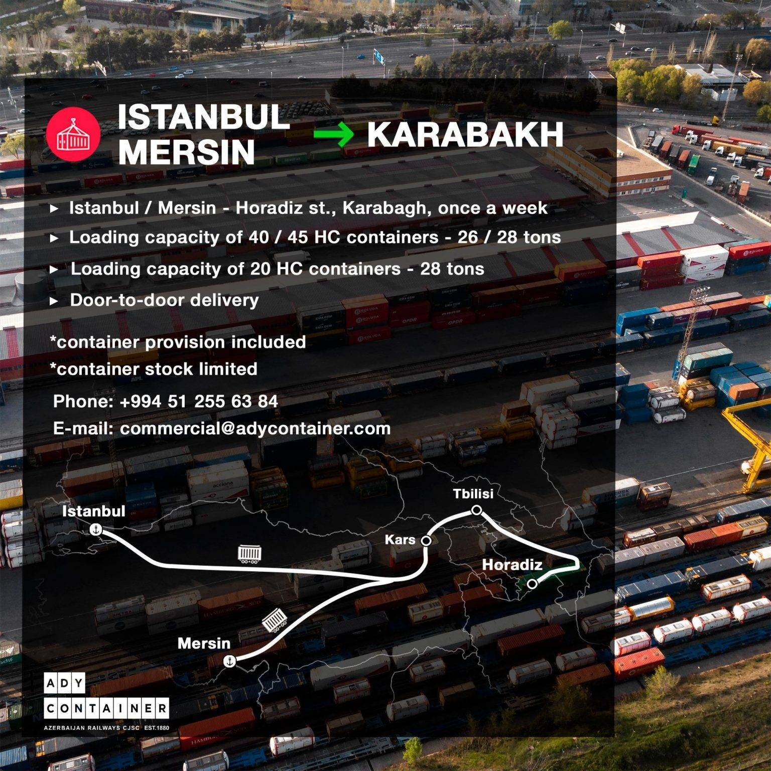 “Azərbaycan Dəmir Yolları” QSC-nin törəmə müəssisəsi – “ADY Konteyner” MMC Türkiyədən Qarabağ iqtisadi rayonuna yükdaşımalara başlayır.