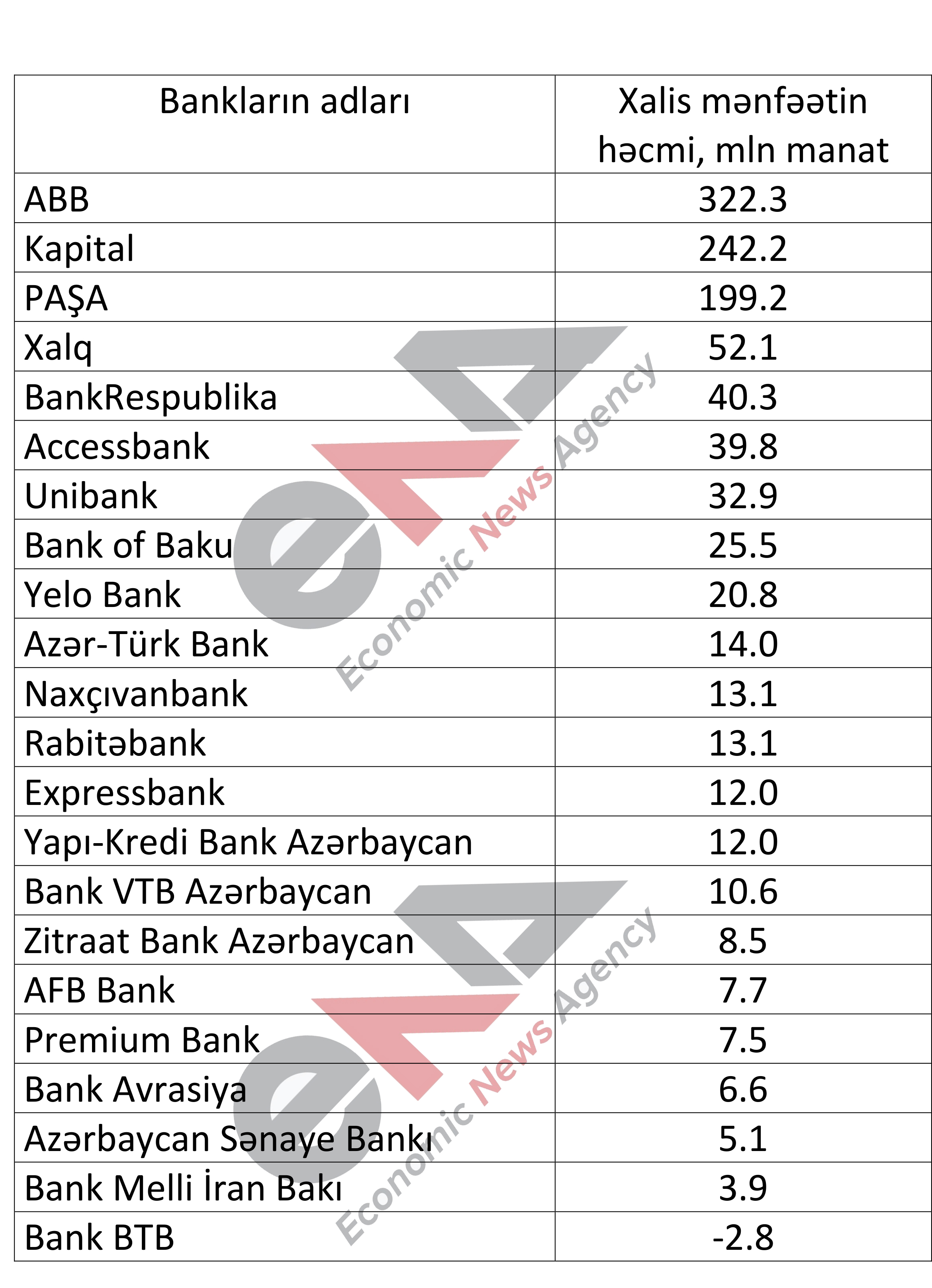 Azərbaycanda maliyyə sektorunda ötən il 25 bank vardısa, ilin sonuna 23 bank qaldı. Bu banklar ümumilikdə 1 milyard manatdan yuxarı xalis mənfəətlə çıxdılar. ENA.az xəbər verir ki, bu mənfəətin 764 milyon manatı 3 bankın - ABB, Kapital, PAŞA bankın payına düşür. Qalan 13,6%-i isə 20 bank öz arasında bölüşdürür.