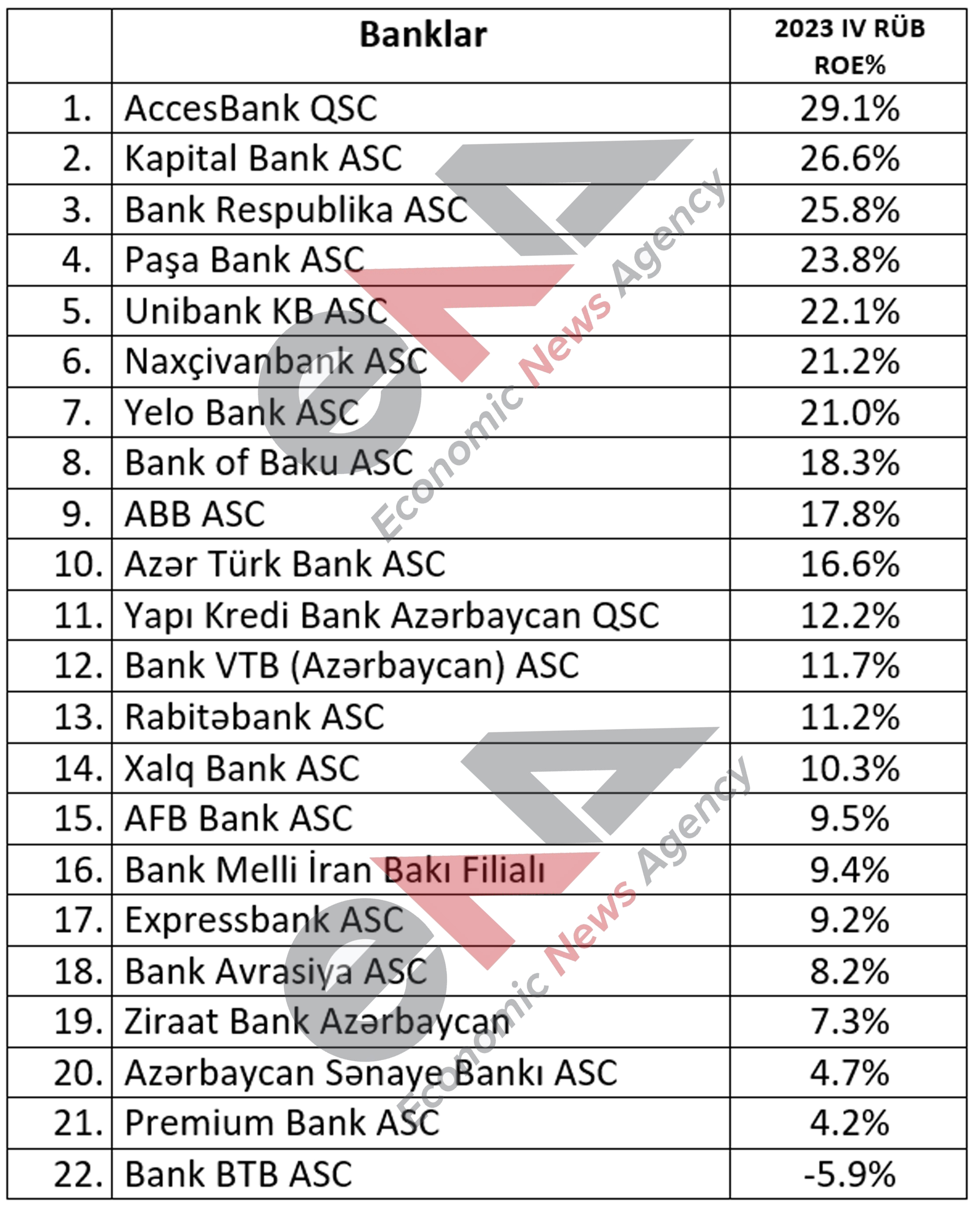 ENA.az təqdim etdiyi renkinq sıralamasına görə, vəsaitlərini ən yaxşı idarə edən Azərbaycandakı Avropa Bankı- AccessBank-dır. 143 milyon 504.87 min manat məcmu kapitala malik olan bankın ROE göstəricisi 29,1% təşkil edib. TOP-3-ə daxil olan digər banklar isə Kapitalbank və Bank Respublikadır.