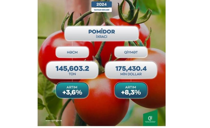 2024-cü ildə Azərbaycan 175,4 milyon ABŞ dolları dəyərində 145,6 min ton pomidor ixrac edib.