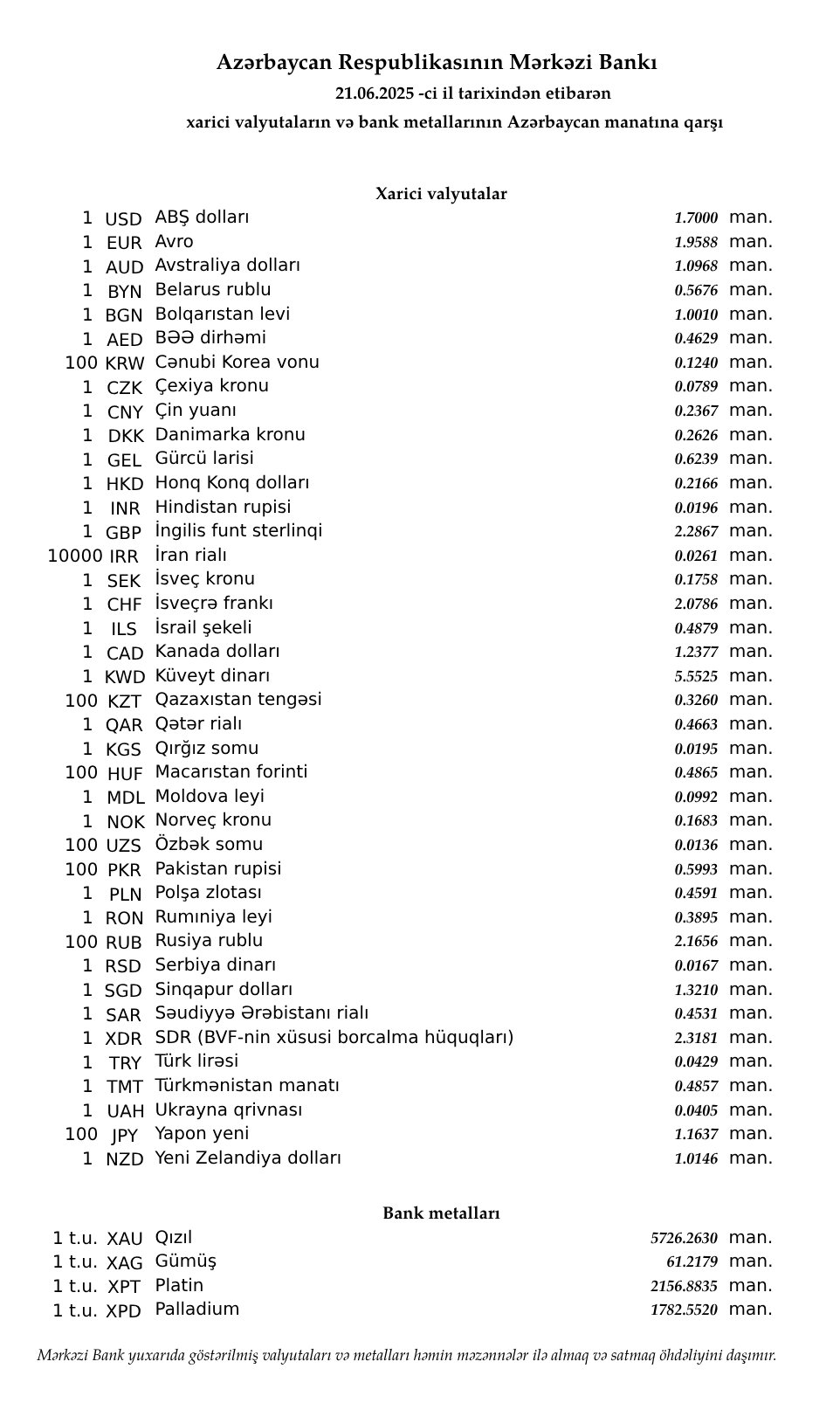 Birja Günün valyuta məzənnələri (21.06.2025) Ən vacib xəbərləri Telegram kanalımızdan OXUYUN! (https://t.me/enaxeber) Əlaqəli mövzular: Azərbaycan nefti bahalaşıb (25.04.2026) Azərbaycan nefti 1 dollar ucuzlaşıb (24.04.2026) Qızıl və gümüş ucuzlaşıb (24.04.2026) Neft bahalaşır (24.04.2026) Günün valyuta məzənnələri (24.04.2026) Azərbaycan neftinin qiyməti 113 dolları keçib (23.04.2026) Qızıl və gümüş ucuzlaşıb (23.04.2026) "Brent" markalı neftin qiyməti 103 dolları ötüb (23.04.2026) Günün valyuta məzənnələri (23.04.2026) Azərbaycan nefti cüzi bahalaşıb (22.04.2026) Qızıl və gümüş cüzi bahalaşdı (22.04.2026) “Brent” neftinin qiyməti 98 dolları ötdü (22.04.2026)