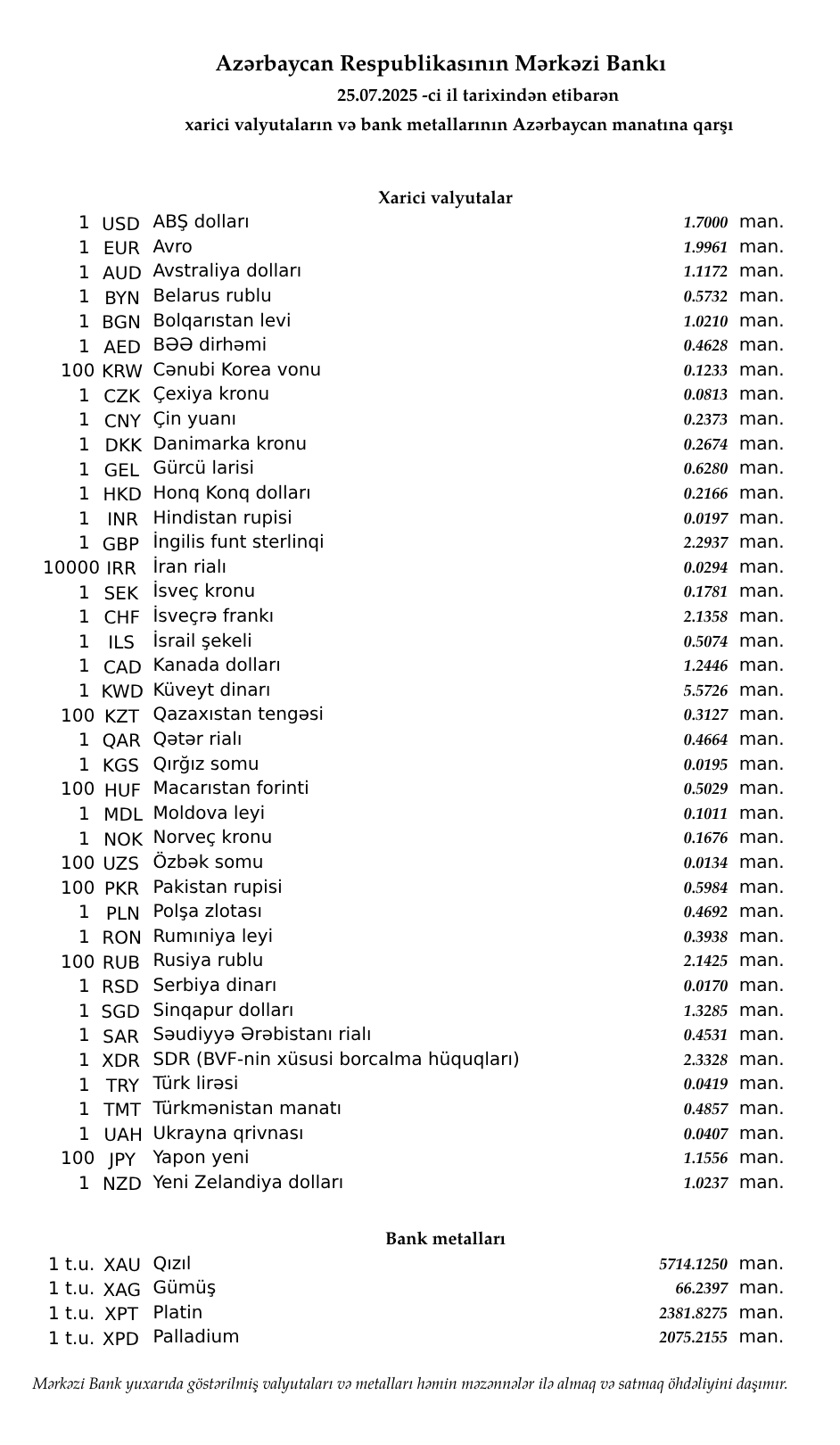 Birja Günün valyuta məzənnələri (25.07.2025) Ən vacib xəbərləri Telegram kanalımızdan OXUYUN! (https://t.me/enaxeber) Əlaqəli mövzular: Azərbaycan nefti bahalaşıb (25.04.2026) Azərbaycan nefti 1 dollar ucuzlaşıb (24.04.2026) Qızıl və gümüş ucuzlaşıb (24.04.2026) Neft bahalaşır (24.04.2026) Günün valyuta məzənnələri (24.04.2026) Azərbaycan neftinin qiyməti 113 dolları keçib (23.04.2026) Qızıl və gümüş ucuzlaşıb (23.04.2026) "Brent" markalı neftin qiyməti 103 dolları ötüb (23.04.2026) Günün valyuta məzənnələri (23.04.2026) Azərbaycan nefti cüzi bahalaşıb (22.04.2026) Qızıl və gümüş cüzi bahalaşdı (22.04.2026) “Brent” neftinin qiyməti 98 dolları ötdü (22.04.2026)