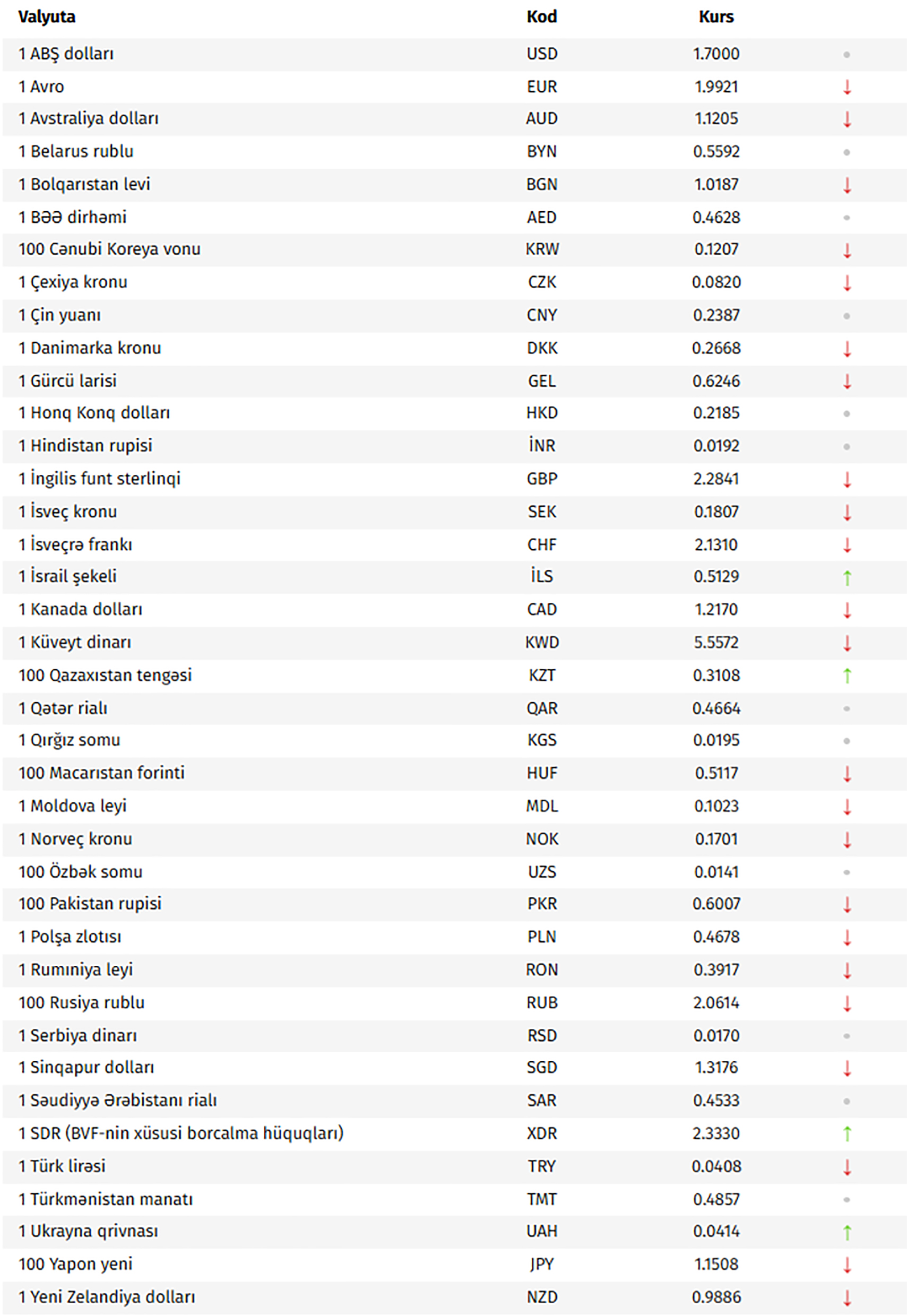 Azərbaycan Mərkəzi Bankının bu günə olan rəsmi valyuta məzənnələrinə əsasən, ABŞ dollarının məzənnəsi dəyişməyərək 1,7000 manat olub.