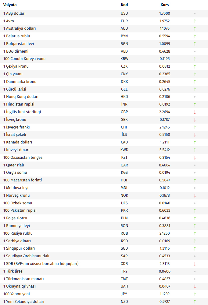 Azərbaycan Mərkəzi Bankının bu günə olan rəsmi valyuta məzənnələrinə əsasən, ABŞ dollarının məzənnəsi dəyişməyərək 1,7000 manat olub.