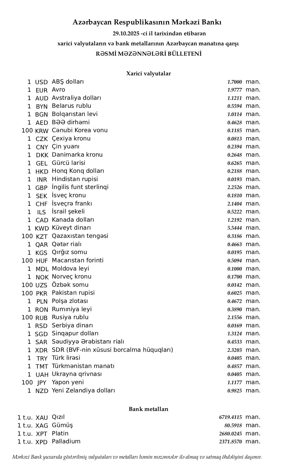 Azərbaycan Mərkəzi Bankının bu günə olan rəsmi valyuta məzənnələrinə əsasən, ABŞ dollarının məzənnəsi dəyişməyərək 1,7000 manat olub.