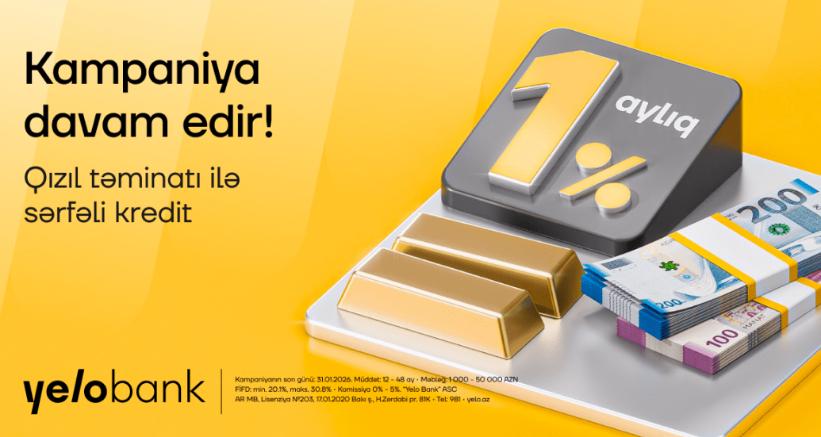 Bankın qızıl təminatlı kredit kampaniyası 31 yanvar 2026-cı il tarixinədək davam edəcək. Bu tarixədək zinət əşyalarını Yelo Bank-a gətirərək nağd pul kreditini aylıq cəmi 1%-dən başlayan faizlə və komissiyasız şərtlərlə əldə edə bilərsən.