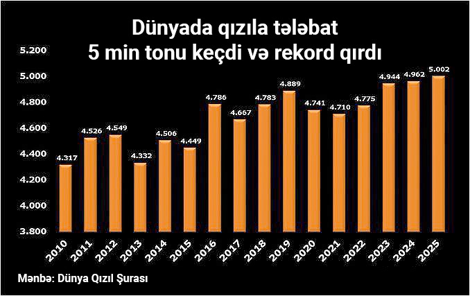 World Gold Council-ın (WGC) yayımladığı “Gold Demand Trends: Q4 and Full Year 2025” hesabatında bildirilir ki, 2025-ci ildə qlobal qızıl tələbi ilk dəfə 5 min ton həddini aşaraq tarixi göstəriciyə yüksəlib.