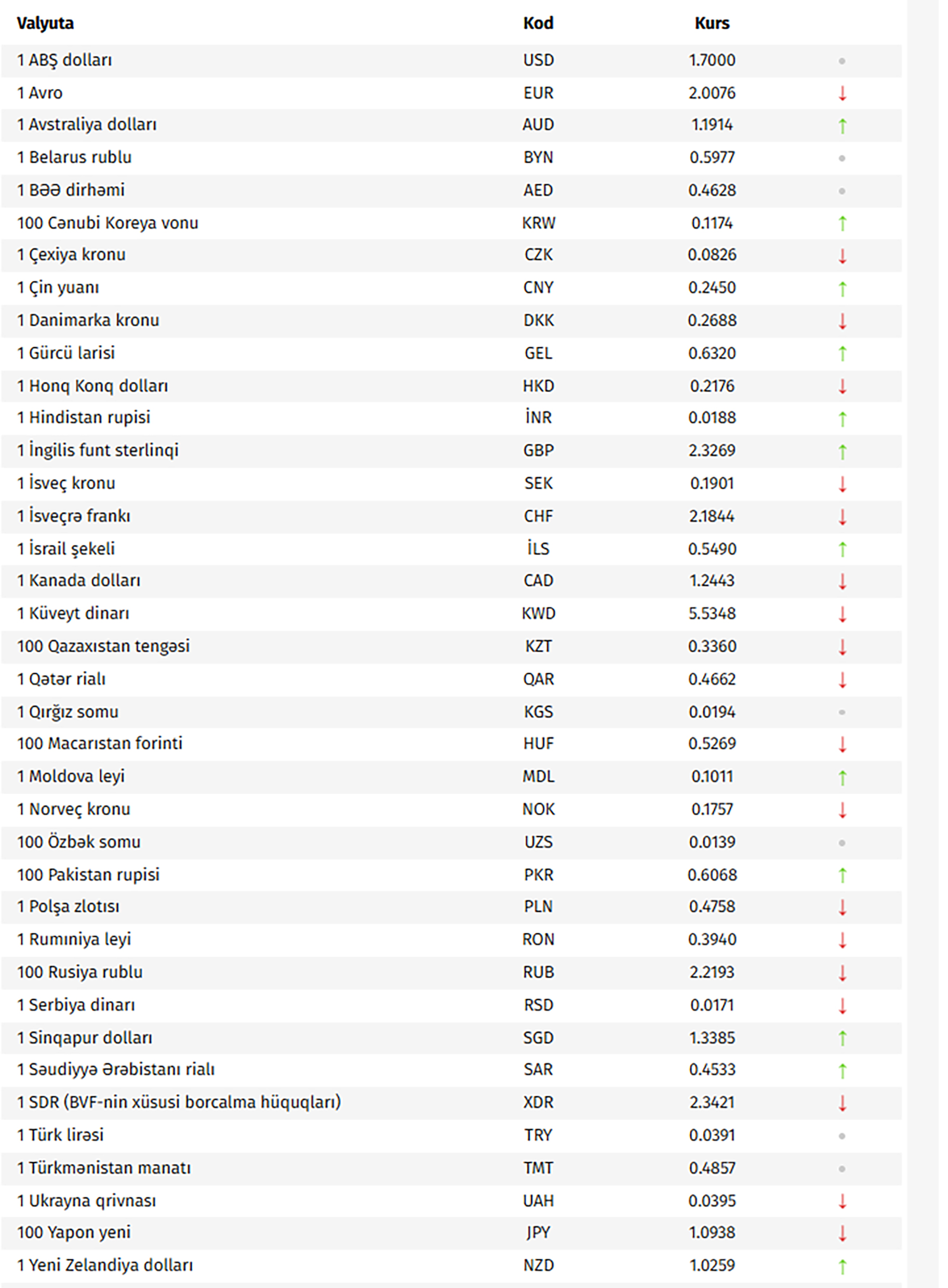 Azərbaycan Mərkəzi Bankının bu günə olan rəsmi valyuta məzənnələrinə əsasən, ABŞ dollarının məzənnəsi dəyişməyərək 1,7000 manat olub.