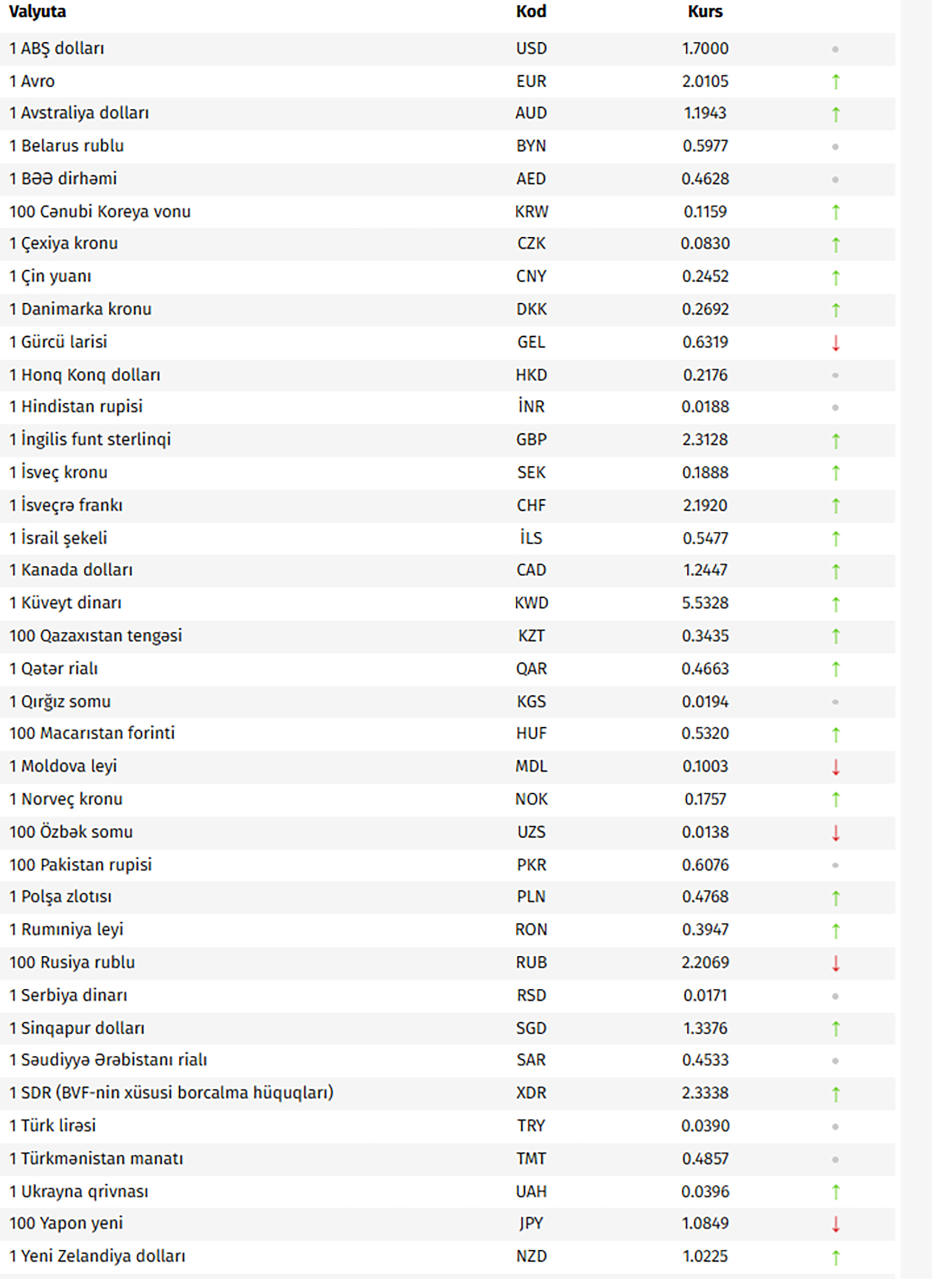 Azərbaycan Mərkəzi Bankının bu günə olan rəsmi valyuta məzənnələrinə əsasən, ABŞ dollarının məzənnəsi dəyişməyərək 1,7000 manat olub.